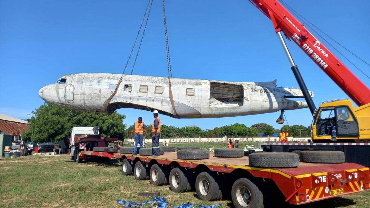 Mombasa Go-Kart bought ZK-BBJ for as small as 300US$, dismantled and transported her on low-loaders to the Go-Kart track where the old lady found new friends who will restore her for display and soon she can be rented for parties with a restaurant set-up inside and underneath.